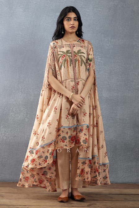 Buy_Torani_Beige Cotton, Silk Embroidery Round Neck Badami Maya Printed Kurta And Pant Set _at_Aza_Fashions