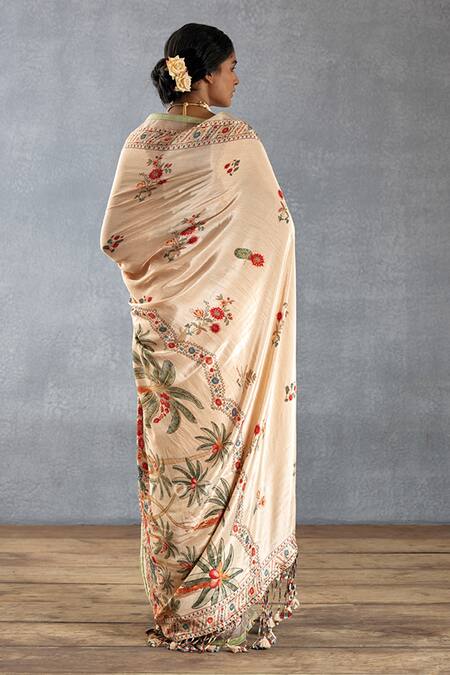 Beige saree featuring botanical digital print with a lace border. Paired with a padded sleeveless blouse and a fringe pallu.