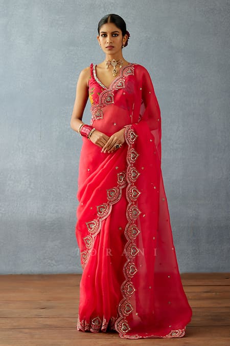 Red saree featuring scallop embroidered border with sequin and resham work on an organza base