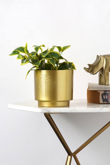 Matt gold circular shaped planter with tree carved motifs in iron base.