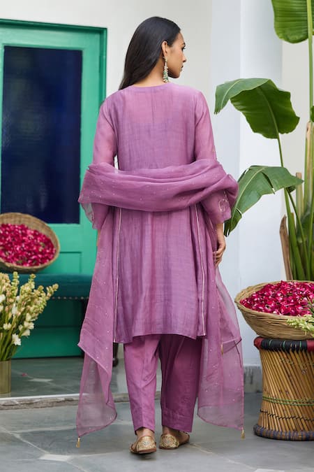 Purple kurta set featuring a straight kurta in silk chanderi with hand-embroidered detailing and subtle metallic accents. It is paired with glace cotton pants and an organza dupatta.