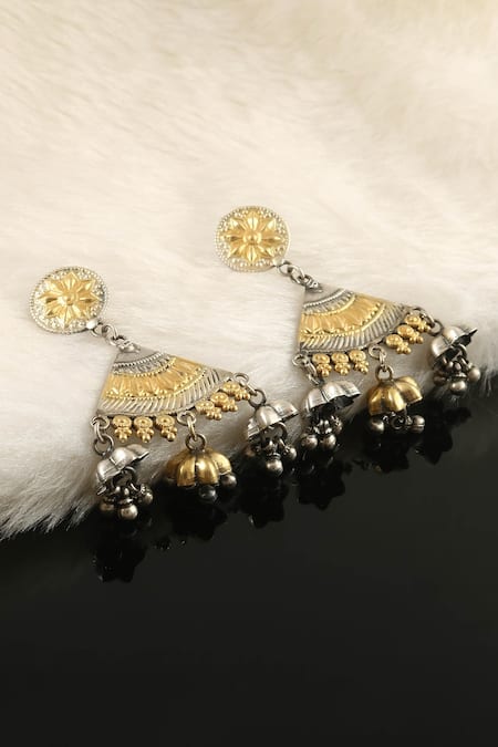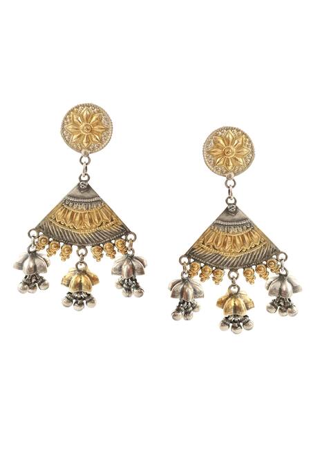 92.5 sterling silver & dual tone earrings with gold floral, triangle carvings & ghungroo drops.
