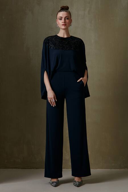 Navy blue cape style jumpsuit with contrast embellishment on the neckline.