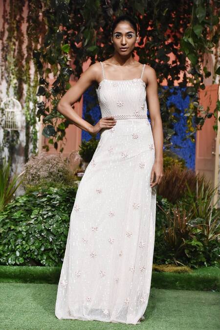 Pale pink tulle gown with chain fringes at backside & all-over floral embroidered motifs.
