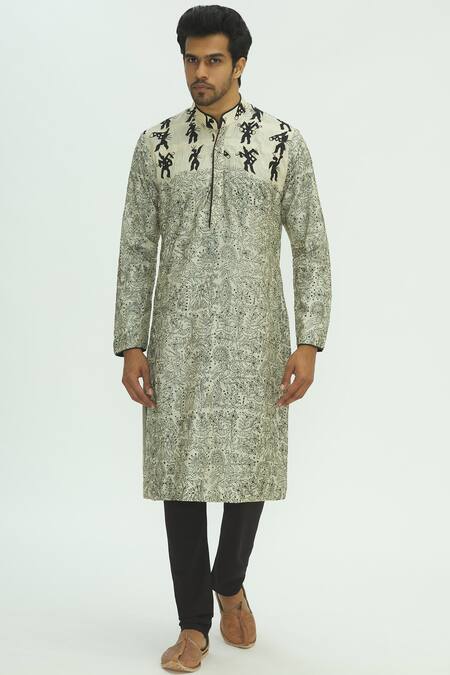 Grey straight kurta with all-over Kantha embroidery & back panel. Comes with black churidar.