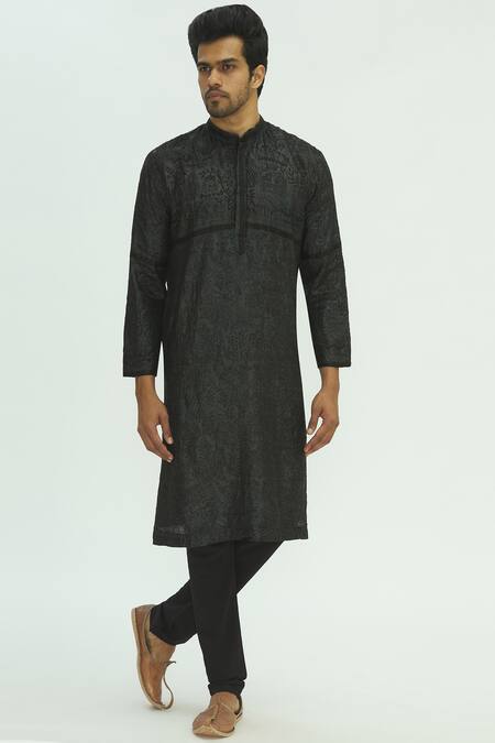 Black straight kurta with all-over Kantha embroidery & back panel. Comes with black churidar.