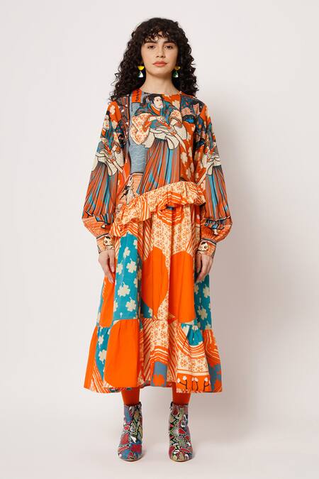 Orange A-line dress with samurai full body, sun digital print & asymmetrical frill detail on the waist and the hem.