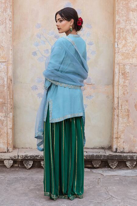 Sky blue kurta featuring hand embroidery with taari work and bell sleeves. Paired with a contrasting dark green sharara and organza dupatta.