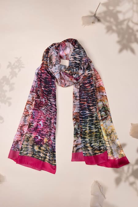 Multi color silk scarf featuring vibrant garden prints and lively colors