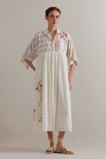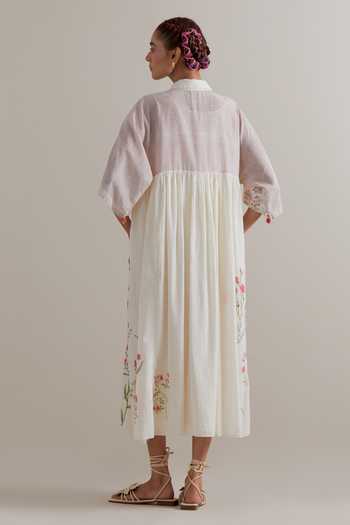 Off white midi dress with pink and green hand-block floral print and gathered waist. Paired with a cotton slip, it features a shirt collar and a front button placket.