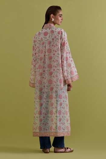 Off white Cotton Chanderi jacket with all-over floral print & hand block printing.