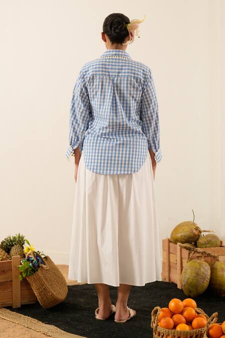 Blue checkered shirt in cotton poplin featuring leafy thread patchwork motifs and lace edges detailing