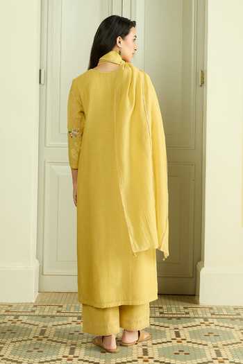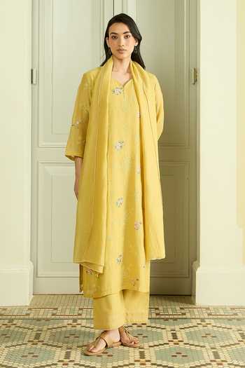 Lemon embroidered floral kurta set defined by delicate floral embroidery across the kurta and sleeves, with fine thread work adding subtle texture. Paired with matching pants and a coordinated dupatta finished with signature tassels.