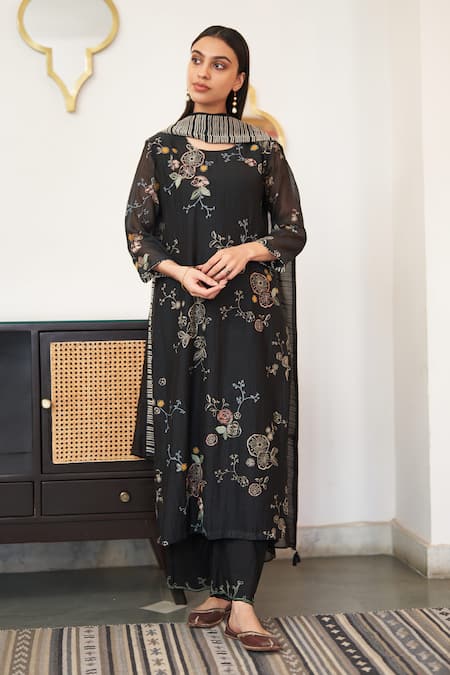 Black kurta featuring floral applique and thread embellishments. Paired with a matching pant and a tassel bordered sheer dupatta.