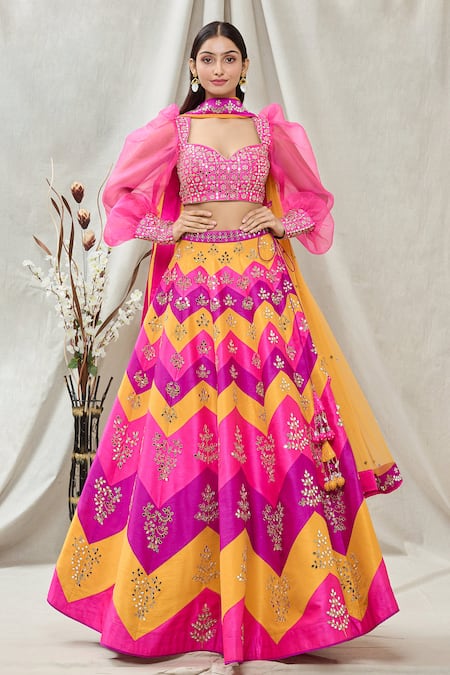 Multicolor lehenga with chevron pattern & mirrorwork embroidered motifs. Paired with puffed sleeve blouse & dupatta.