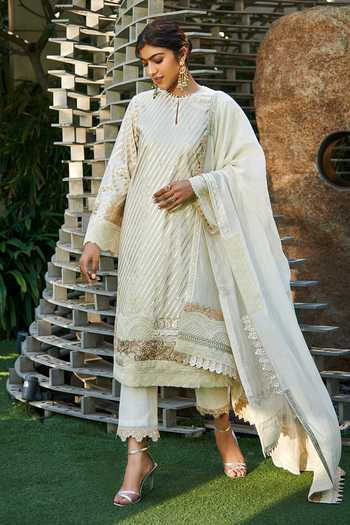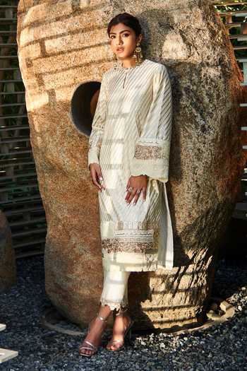 Ivory, gold kurta with woven stripes and lace trims on the hems. Comes with chanderi straight pants and a georgette dupatta.