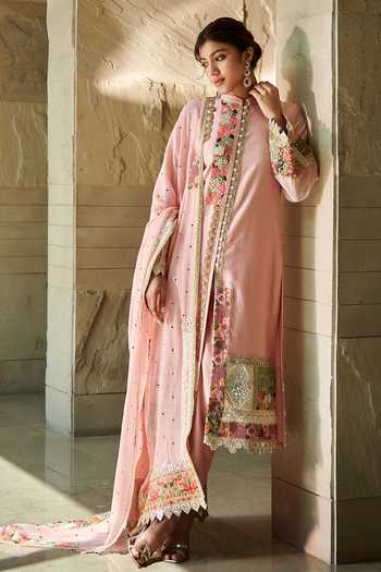 Peach chanderi front open kurta enhanced with patchwork along the centre and hem. Paired with peach chanderi trousers and a georgette dupatta accentuated with mukaish, lace and patchwork border.