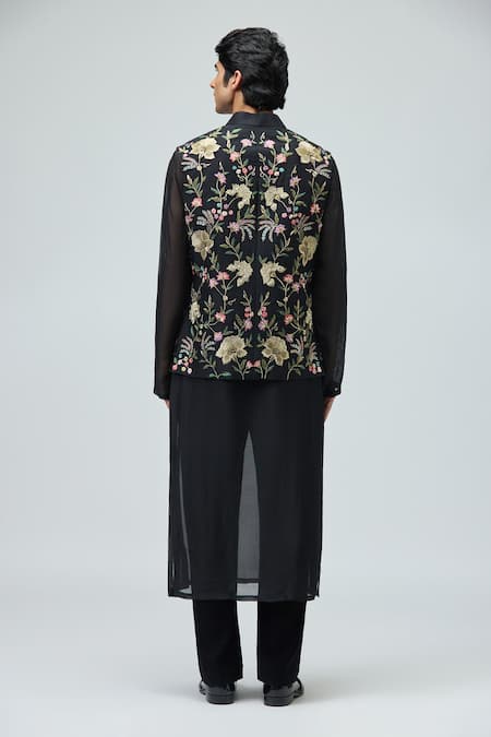 Black Nehru jacket in Chanderi silk features intricate floral embroidery across the front. Finished with a mandarin collar, the sleeveless silhouette layers over inner garments.