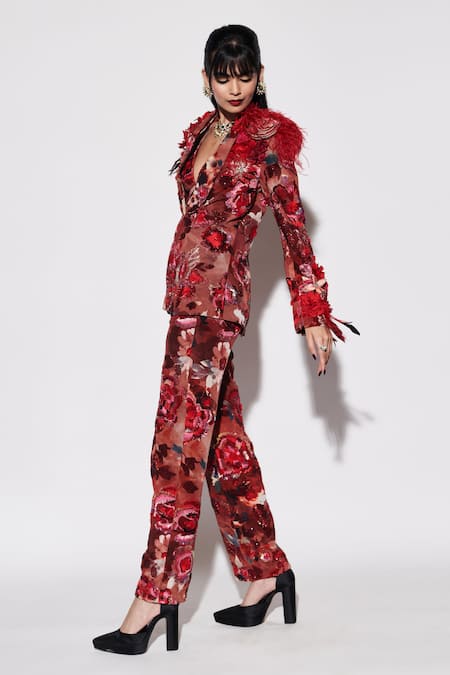 Red jacket featuring all-over floral print with 3D embroidered corsages, Resham, and sequins. Paired with a floral printed bralette and coordinating trouser highlighted with sequins.