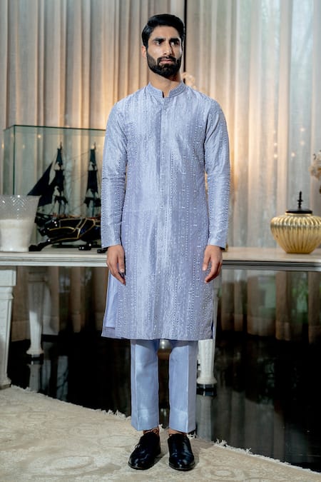 Lilac blue kurta with floral, geometric embroidery in stripes. Paired with pant.