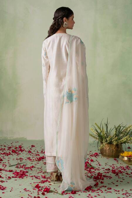 Ivory kurta made from chanderi silk featuring floral patch and thread embroidery with sequins. Paired with straight pants and an organza dupatta adorned with crochet lace.