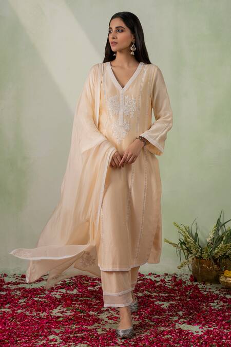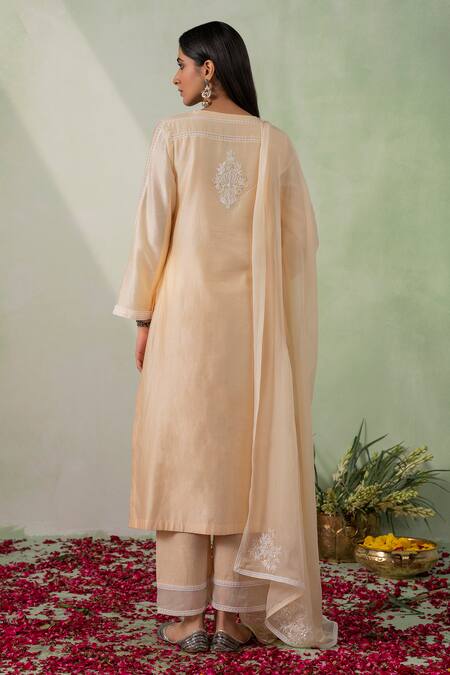 Yellow Kurta Chanderi Silk Embroidered Resham V Neck Panelled Set