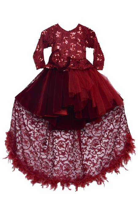 Maroon sequin embellished flared dress with floral motifs all over & overlay detail.