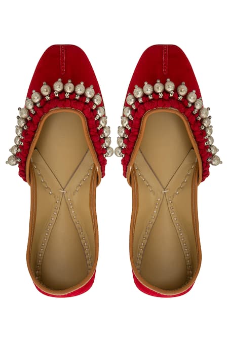 Red juttis featuring a velvet upper with threaded knots and ghunghroos drops