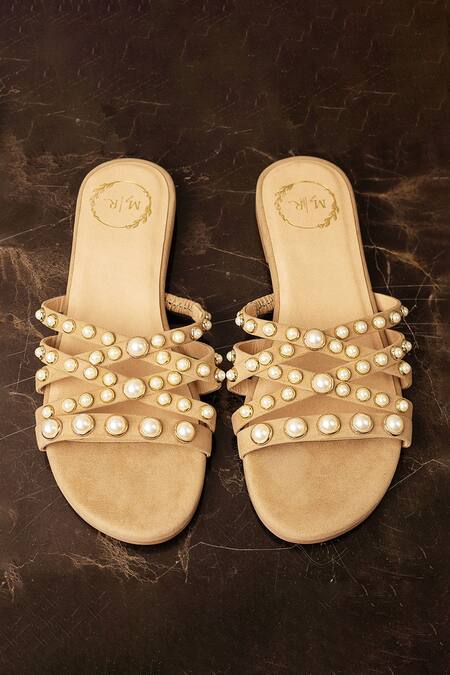Beige velvet flats with pearl embellished criss-cross straps & stack heels.