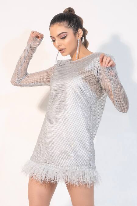 Silver dress with crystal mesh embroidery & feather on hem. Comes with slip.