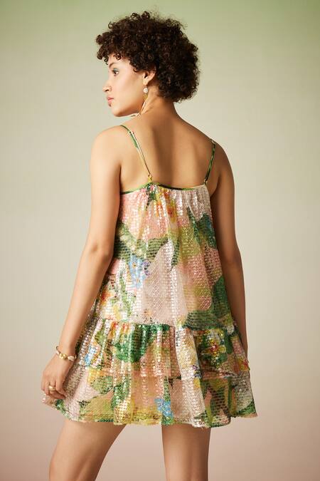 Multicolor sequins enhancing the floral motifs, Flouncy tiered hem design