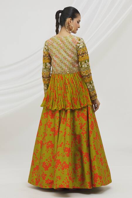 Olive silk jacket with crepe satin ghera and jaal print, including thread, mirror and zari embroidery. Comes with a kalidar lehenga with gold cutwork embroidered waistband and a padded bustier.