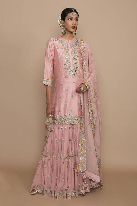Pink Silk Embroidered Kurta Sharara Set