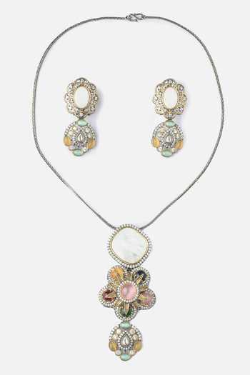 White pearl and multicolor gemstone embellished floral shaped pendant necklace. Paired with matching earrings featuring similar embellishments.