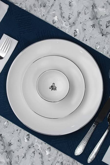 Ivory dinner set with elephant motifs, including 6 dinner plate, 6 quarter plate, 1 oval plate, 1 curry large bowl, 1 curry medium bowl, 6 soup spoon, 6 soup bowl, 6 veg katori bowl.