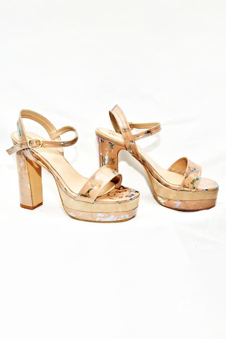 Ankle buckle strap for secure fit, Square toe design for added comfort, Abstract print detailing for a unique look