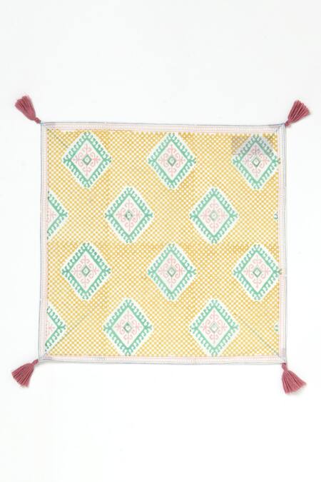 Yellow square shaped 4 pcs napkins with cream geometric hand block printed & tassel detailing on 4 corners.
