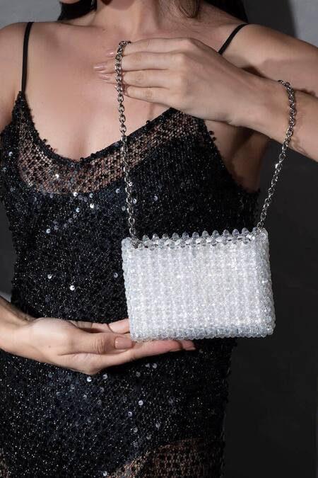 White mini bag in glass crystal bead embellishments. Comes with metal chain link handle.