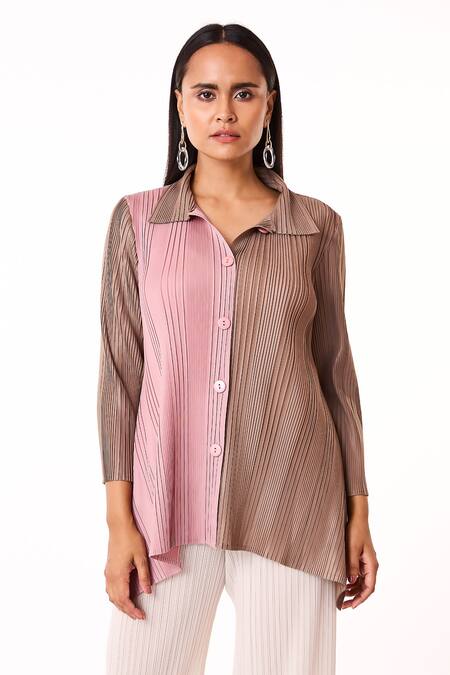 Beige and pink dual color-blocked shirt featuring a collared neck and front button placket