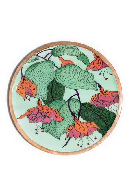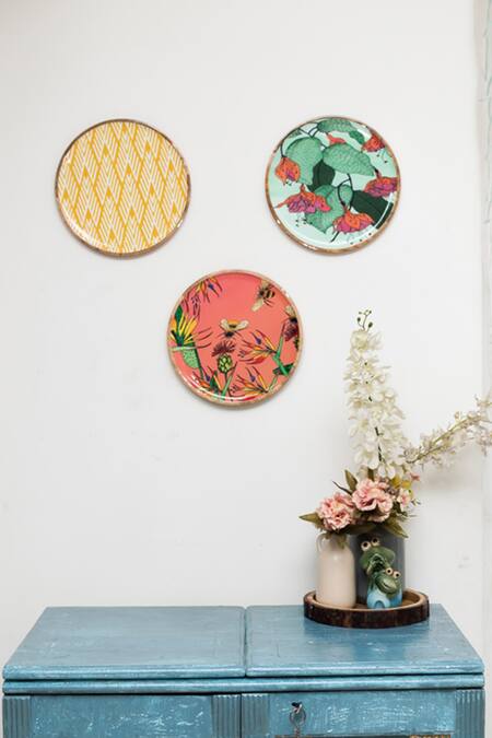 Floral prints, chevron & bee prints, Product Finish: Multicoloured, Comes with a wall hook for easy installation, Dimensions in inches: (L x W x H) : 10 x 10 x 0.6, Product weight (in kg): 1.5, Note:, Easily doubles up as a snack plate or a starter plate., Products are handcrafted; there could be slight variation in the product from the image., Only selling set of 3 wall plates