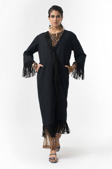 Black overlap style jacket with fringe detail on the hems.