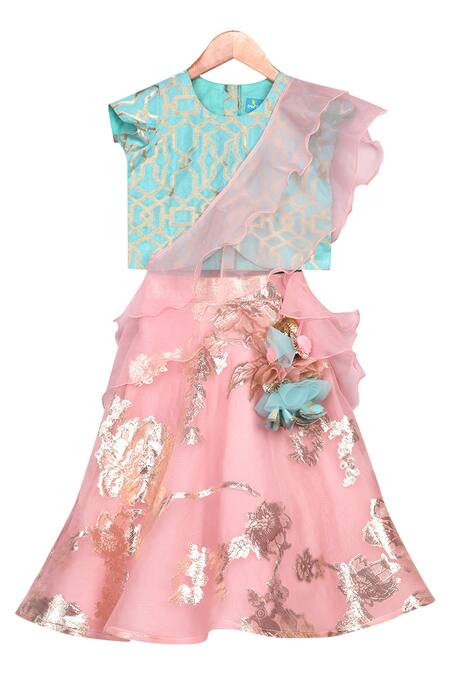 Geometric pattern woven blue blouse with all-over foil prints pink lehenga & dupatta.
