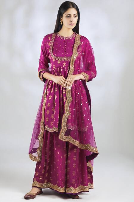 Rani pink flared kurta with all over baroque woven motif & placement embellishment. Comes with gharara pants & dupatta.