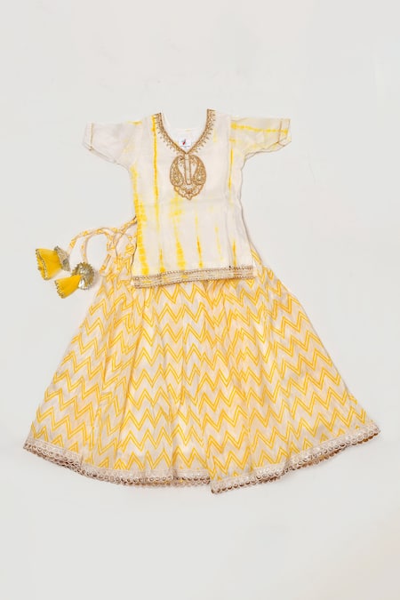 Yellow lehenga set featuring a shibori pattern blouse with paisley embroidery. Paired with a chevron printed lehenga and a matching dupatta.