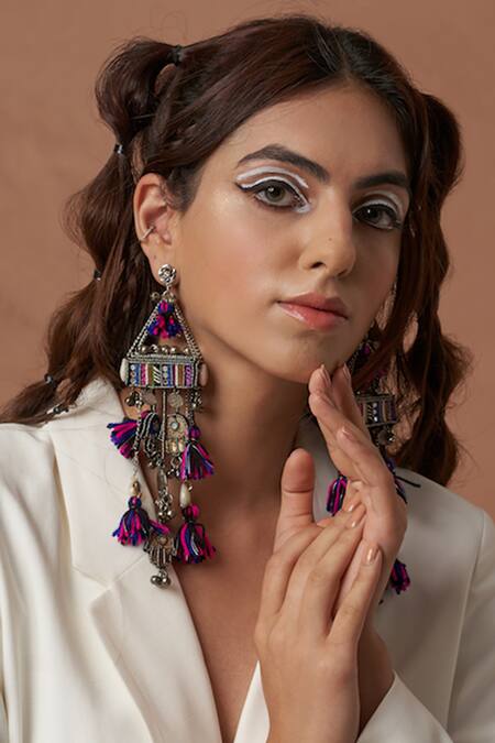 Silver tone dangler earrings, accentuated with multi-colored tassel ornamentation, beads, ghungroo embellishments & hamsa motifs.