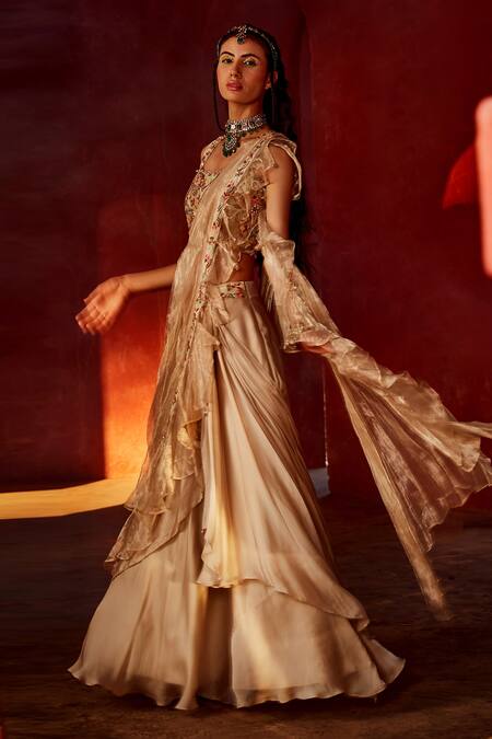 Ivory blouse with zardozi, sequin, thread embroidery in floral pattern. Paired with skirt & ruffle drape.