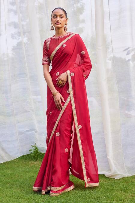 Red-maroon saree with floral zardozi embroidered buttis. Comes with pintucked blouse & petticoat.