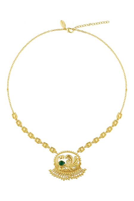 22kt gold plated pendant necklace featuring embossed peacock motifs and bead drops. Embellished with Chatham emerald for added elegance.