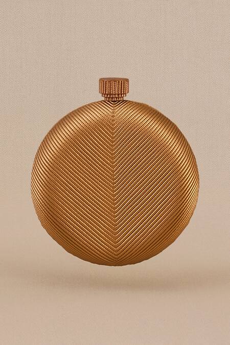 Gold circular clutch featuring a quilted chevron pattern in a faux leather base