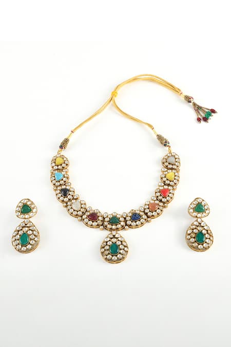 Navratna stone embellishments on the necklace, Adjustable dori closure for the necklace, Push back clasp for the earrings